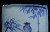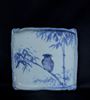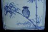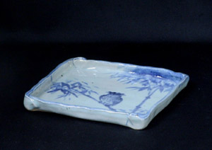 粗い布目を押し付けて手びねり成形後、竹林の梟を絵付けした面白いお皿です。各角部は耳を折返し重ねて成形され、絵柄との調和で魅力あるお品となっています。