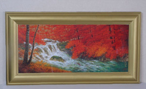 燃えるような奥入瀬渓谷の紅葉が特徴的な「元宋の赤」で描かれた作品です。