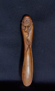 物静かな表情の達磨大師に大粒の数珠が印象的で流線型の器形との調和が見事な茶合です。