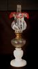 外側のフリル火屋の赤の縁取りと本身の乳白色のマーブル模様にランプ本体の白色台座の調和が素晴らしく、気品の中にも存在感のある見事なランプです。